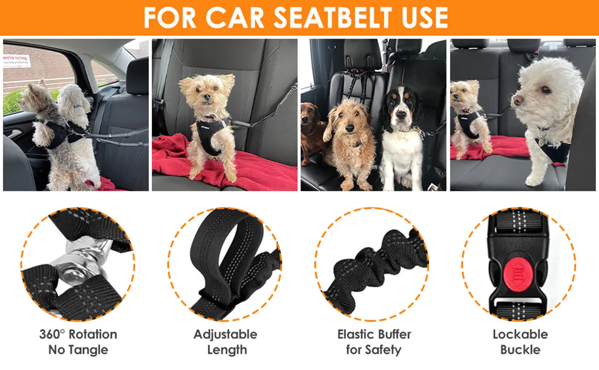 Tangle Free Design - Never worry about your dogs getting tangled with our innovative tangle-free swivel piece. The heavy-duty 360° Swivel metal Rotation buckle is easy to hook and it is perfect to avoid tangle. With this smart design, it could help to ensure the safety of your pets and prevent you from distracting when driving. It allows your dogs to sit, stand, lie down comfortably or reach to see out the window but keep the dogs from jumping around in the car.